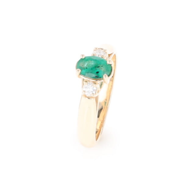 Designed with luxurious elegance, this Emerald Three-Stone Trellis Ring features a 14k yellow gold setting with a center emerald, two accenting diamonds of 0.13ctw, and superior craftsmanship. An exclusive signature piece from Hawkes & Co, this exquisite ring will dazzle the wearer for many years to come.