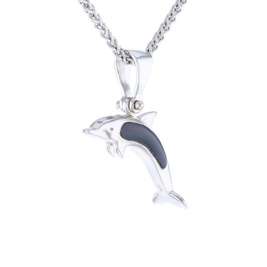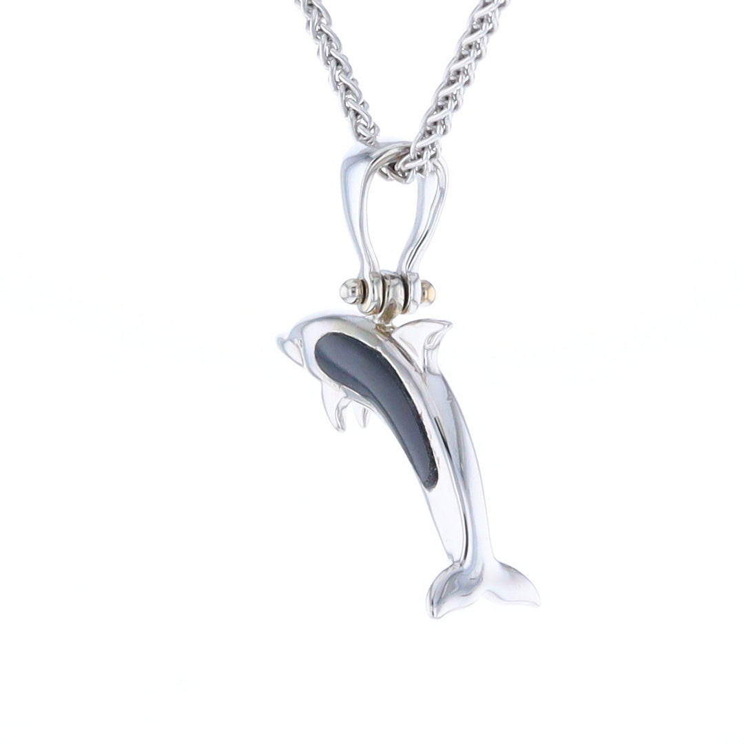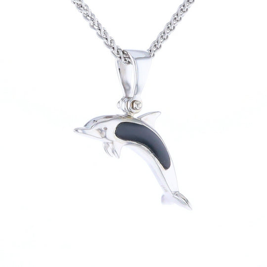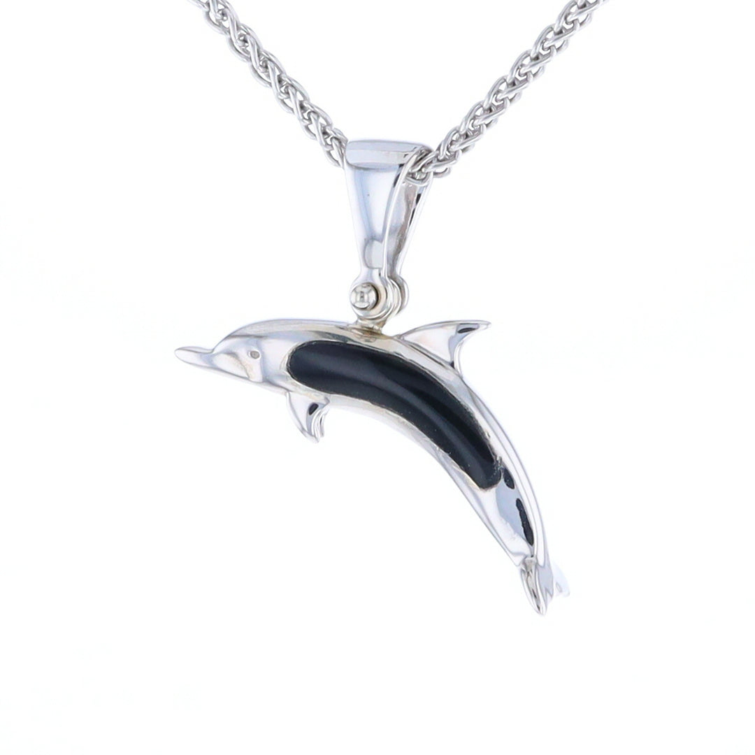 14K White Gold Natural Onyx Inlaid Dolphin Pendant