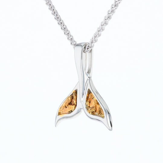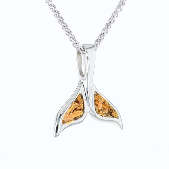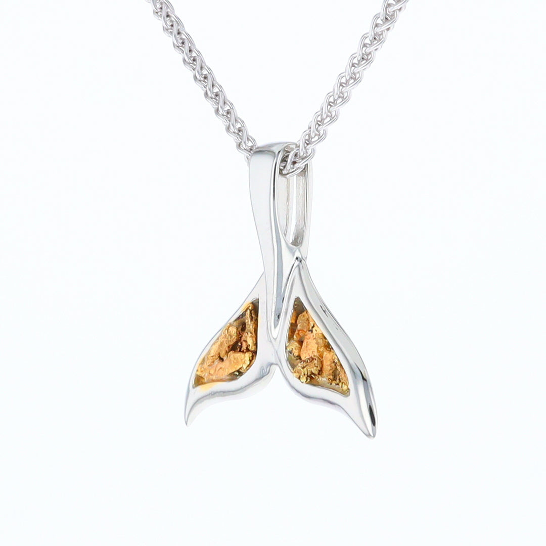 Medium Whale Tail Pendant Double Sided Inlaid With Natural 22kt Nuggets. Designed With Attention To Detail. Anatomically Correct In Every Way. This Pendant Is Like Buying 2 For The Price Of 1, Because It's Also Finished On The Back Allowing It To Be Worn In Reverse As A Plain Gold Whale Tail Pendant. 14Kt White Gold.