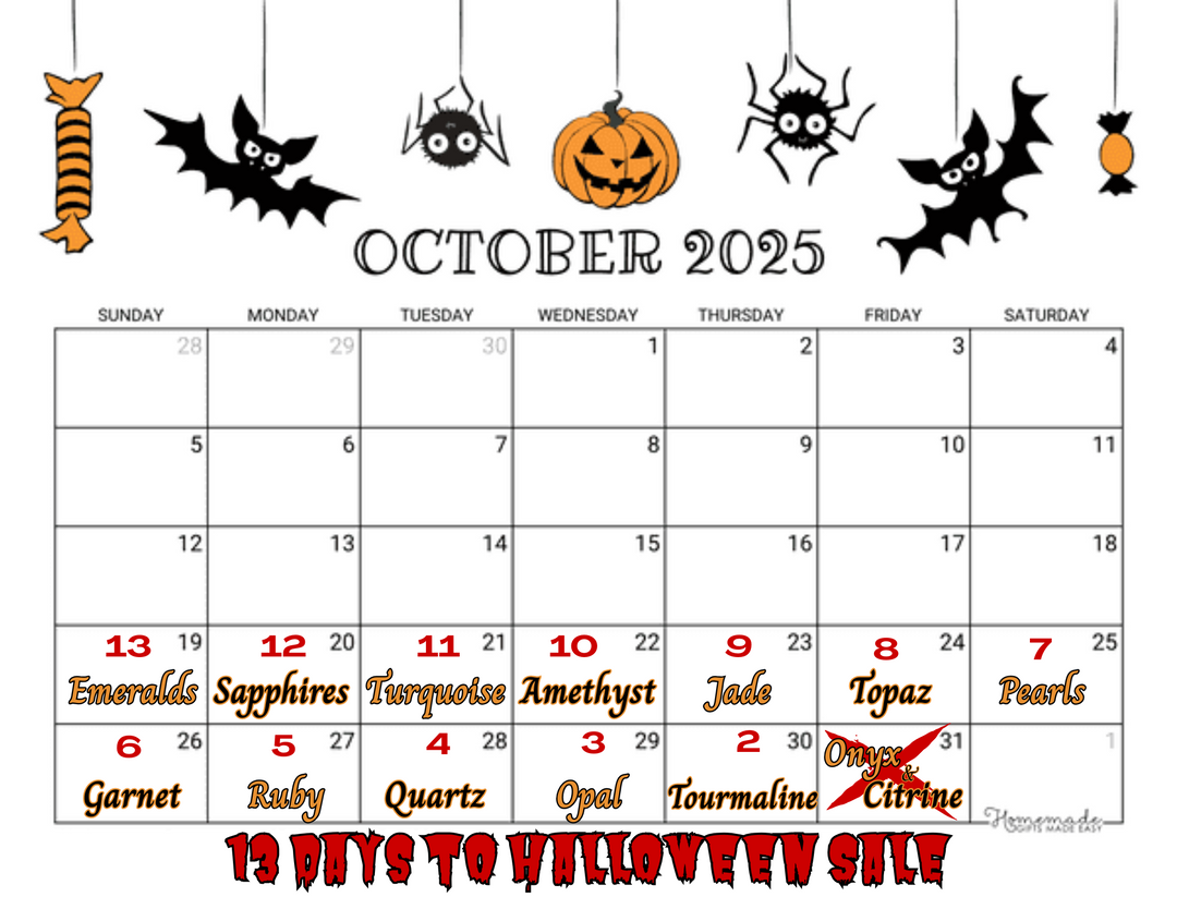Come trick or Treating with us (for gemstones of course)! This year we are counting down the days to Halloween with 13 deals. The last 13 days of October we will have a different Gemstone flavor on sale for 20% off and it's corresponding jewelry for 15%-35% off.